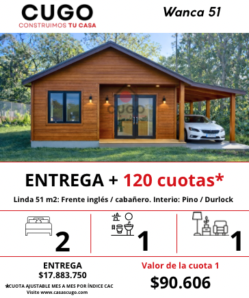 Wanca 51 es un modelo de 51 m², diseñado para aprovechar cada espacio de manera eficiente, ofreciendo una vivienda compacta pero cómoda, ideal para familias pequeñas, primera vivienda o inversión. Su distribución optimizada permite contar con dos dormitorios, baño completo y un espacio integrado de living–comedor–cocina, logrando una casa práctica y bien organizada.